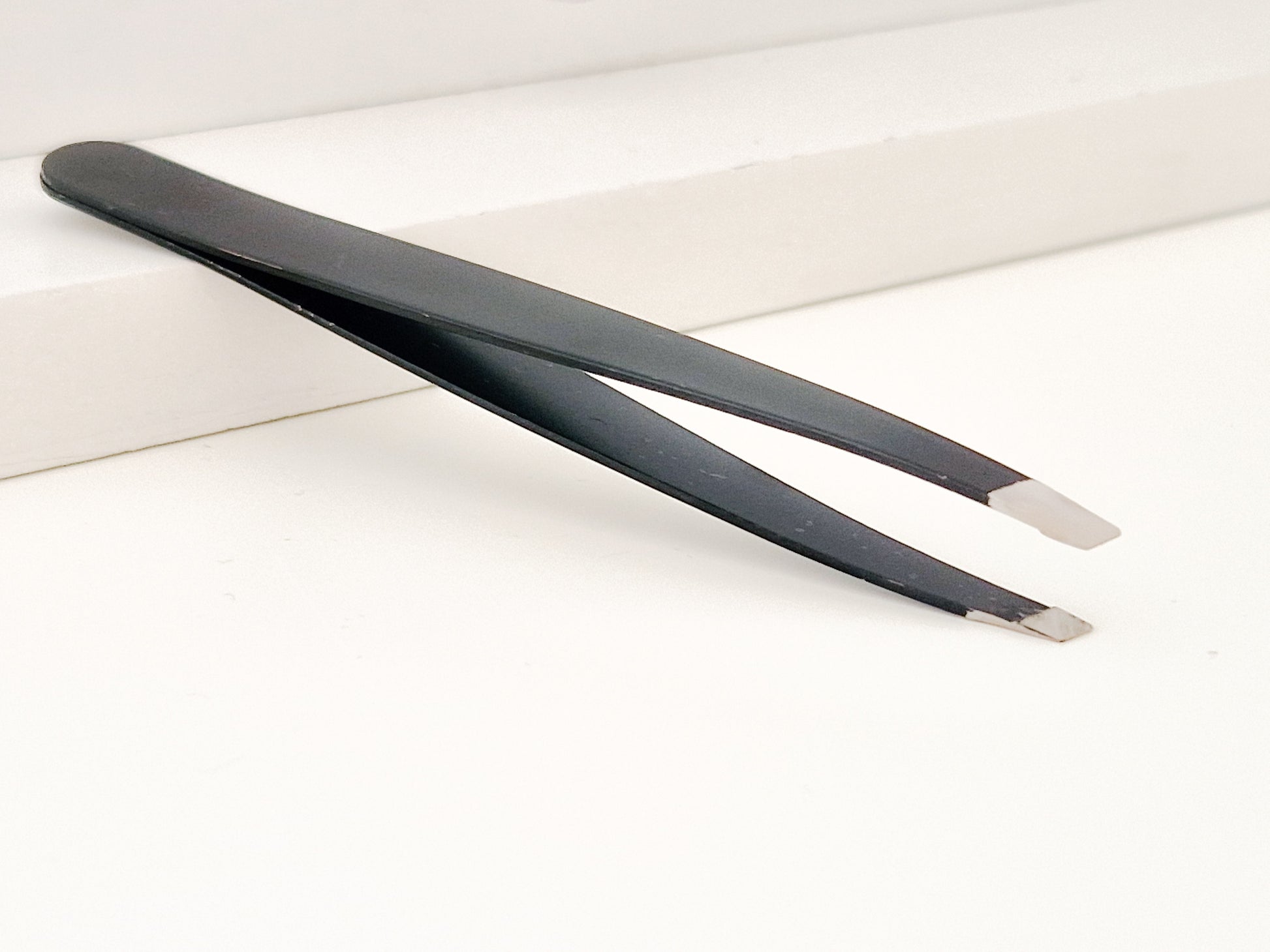 Stainless steel tweezer with slanted eyebrow trimming clip. A professional tool for eyelash extensions. Black matt finish